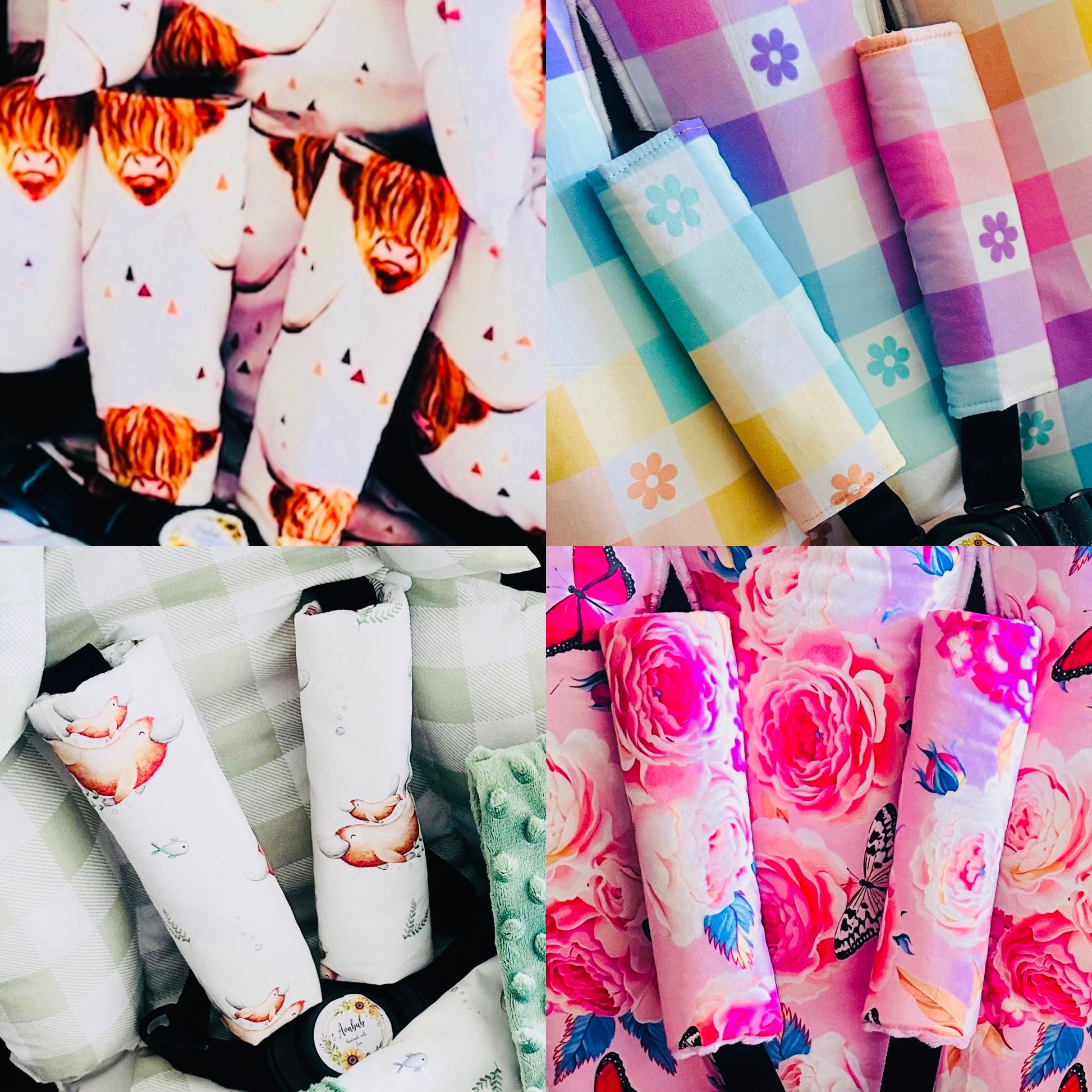Beautifully handmade belt covers, they can be made as an accessory for prams/trolleys ect and seat belts for adults. Choose from two sizes, Newborn - Toddler or Child - Adult. Child - Adult is our Pram Belt Cover size!