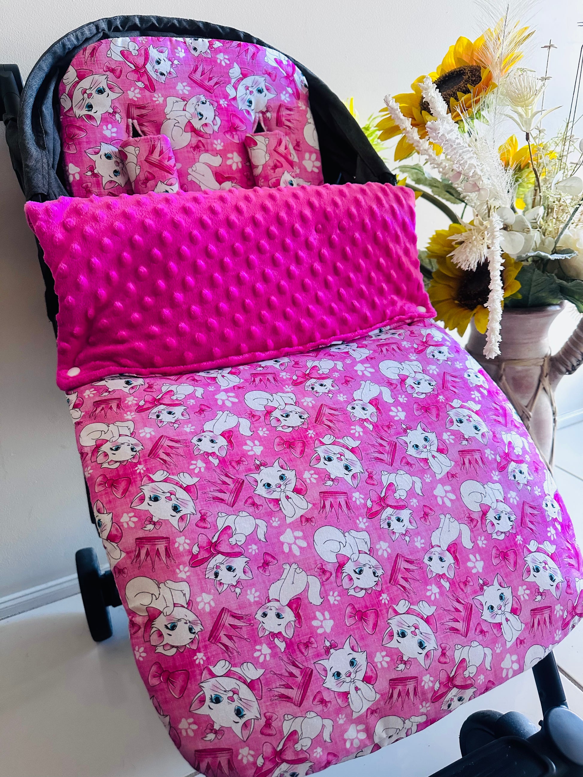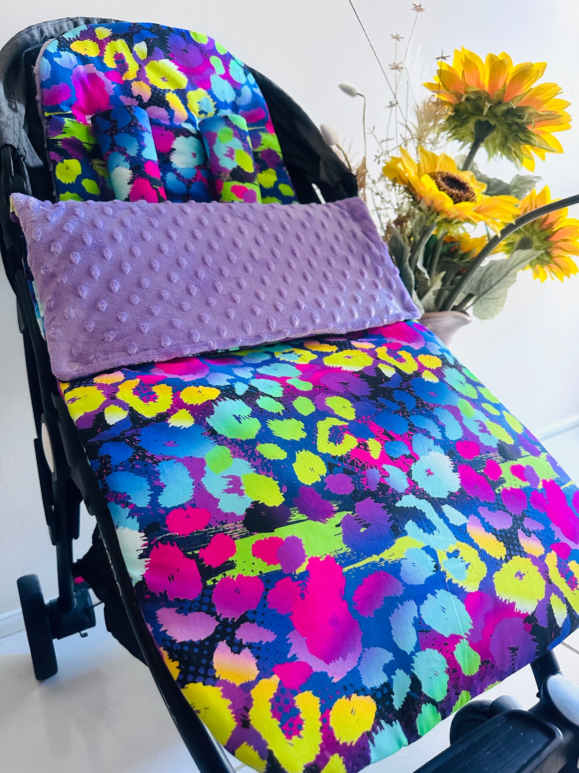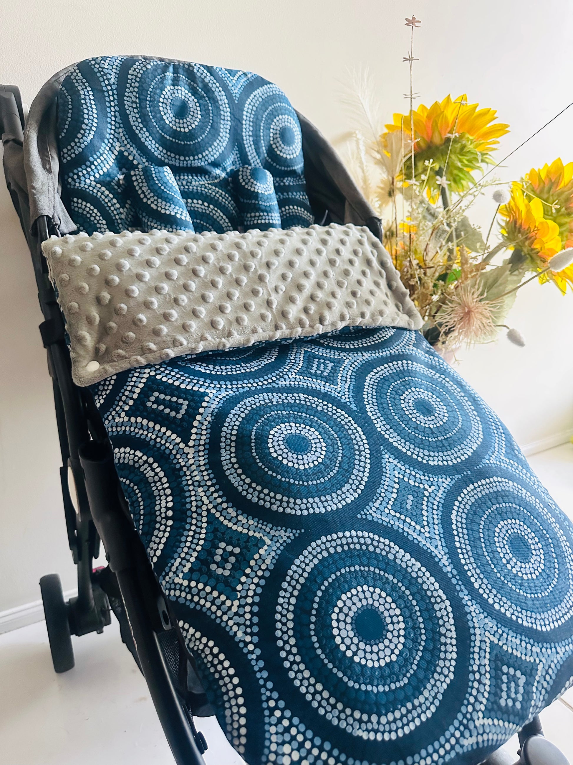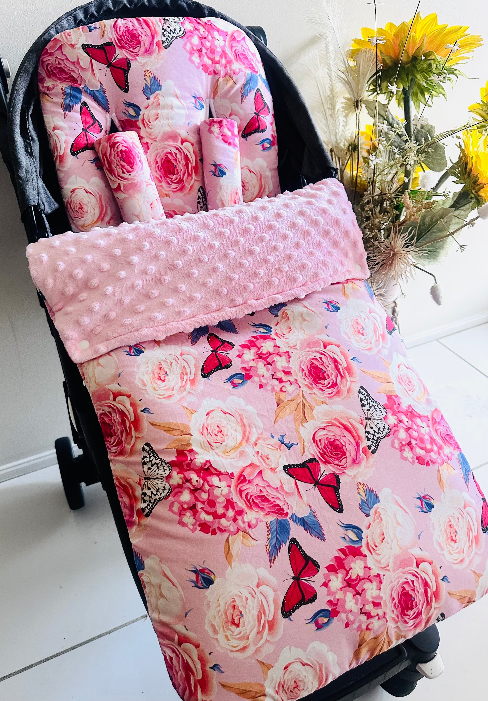 Introducing our beautiful Footmuff Full Set’s. Sets include:- 1 Pram Liner | 2 Free Belt Covers | 1 Footmuff ** Optional Head Insert. Our Sets are backed with gorgeously soft dot minky fleece with an option to add extra padding and water resistance to the pram liner! **All Footmuff’s are universal, fully adjustable with ties or Velcro straps, pram liners can be customised however :)**