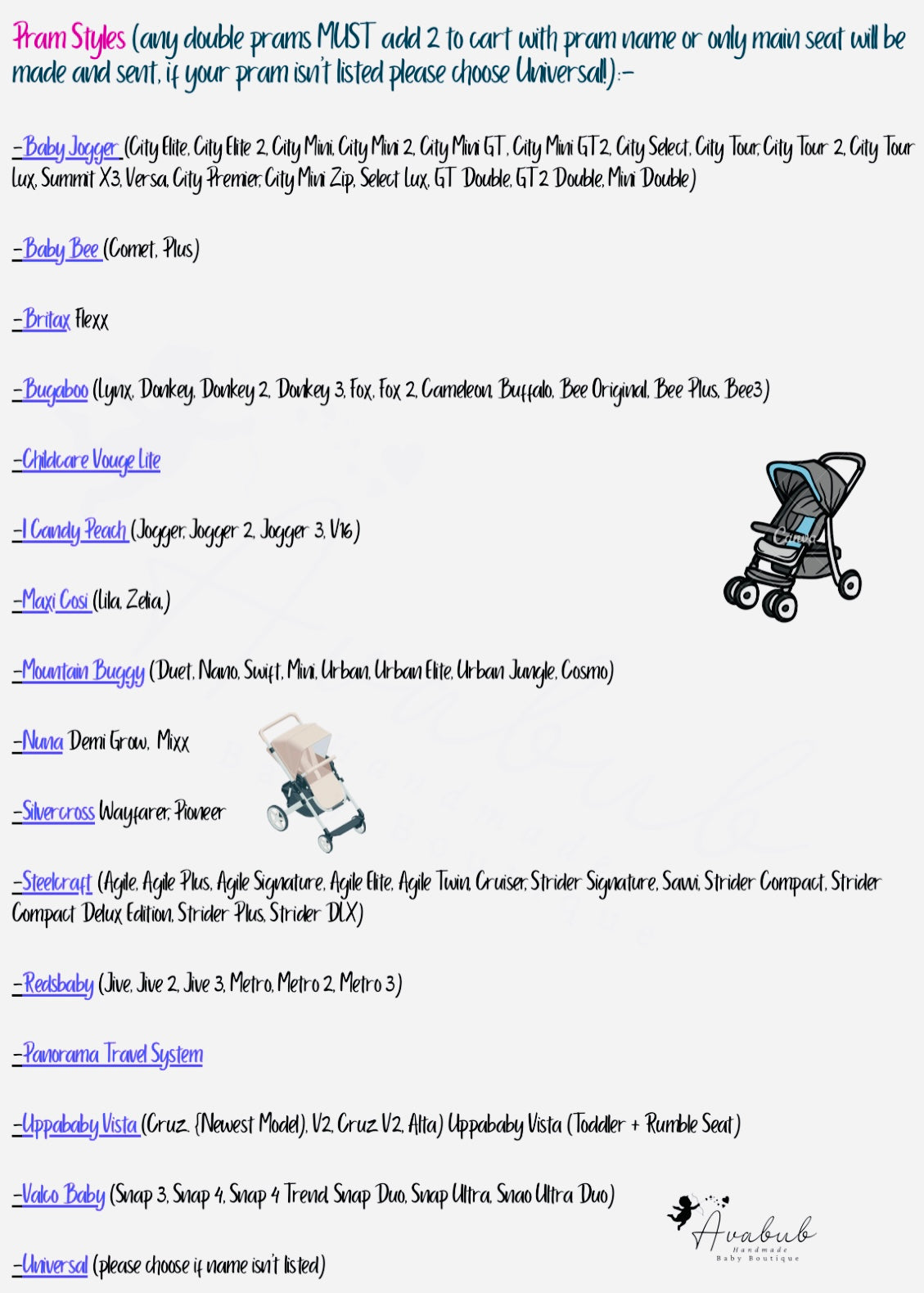 Pram Styles (any double prams wanting 2 liners MUST add 2 to cart with pram name or only main seat will be made and sent, if your pram isn’t listed please choose universal):-