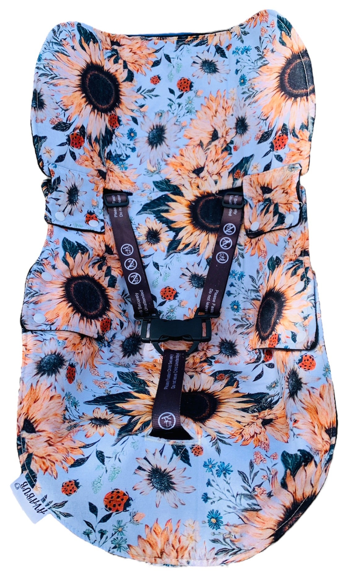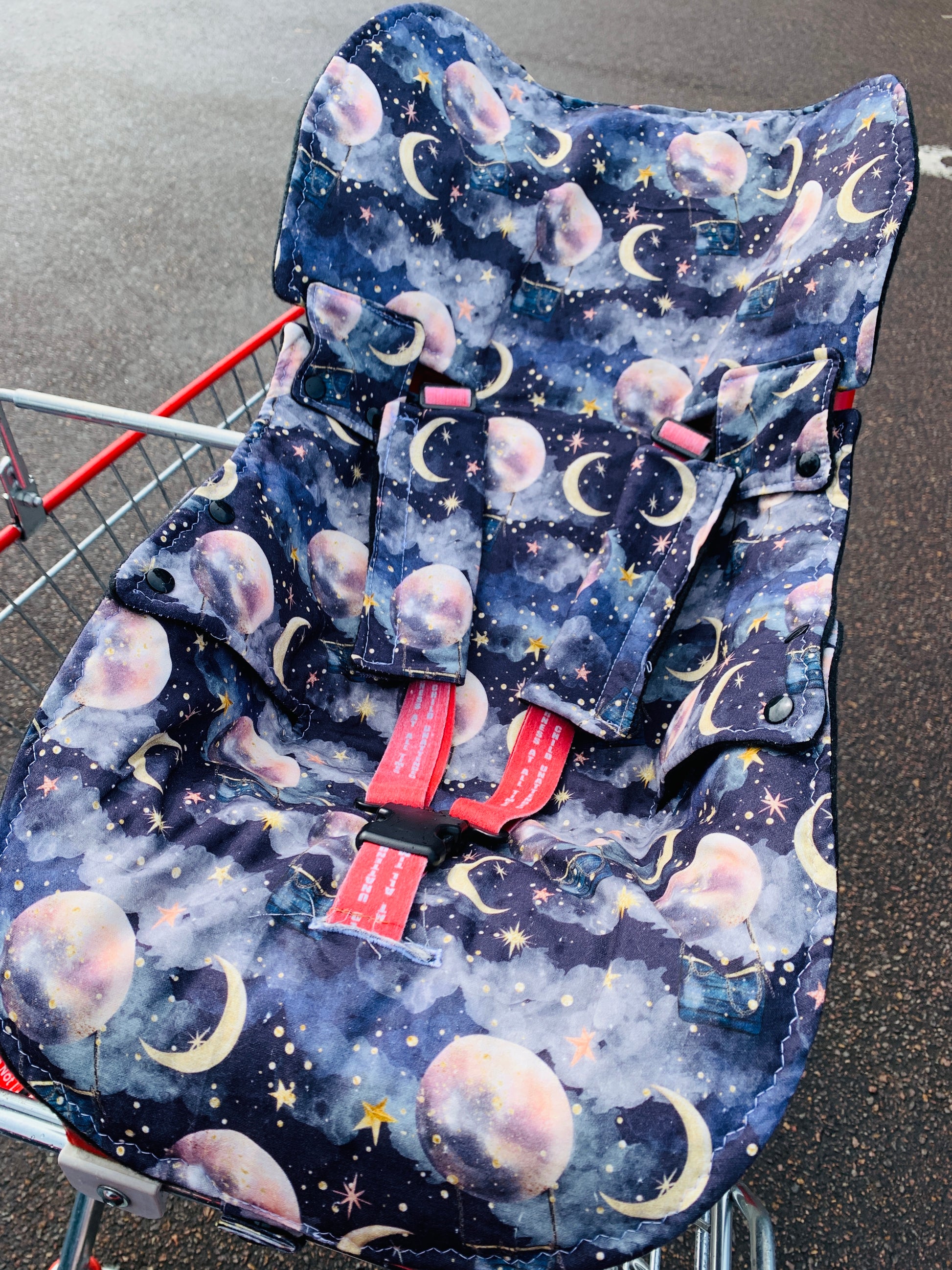 Keep your newborn warm and cosy with our beautiful range of capsule trolley covers. Our covers are 100% cotton on the patterned side, cotton on the back and wadding in the centre back making them super cosy during a shopping trip.